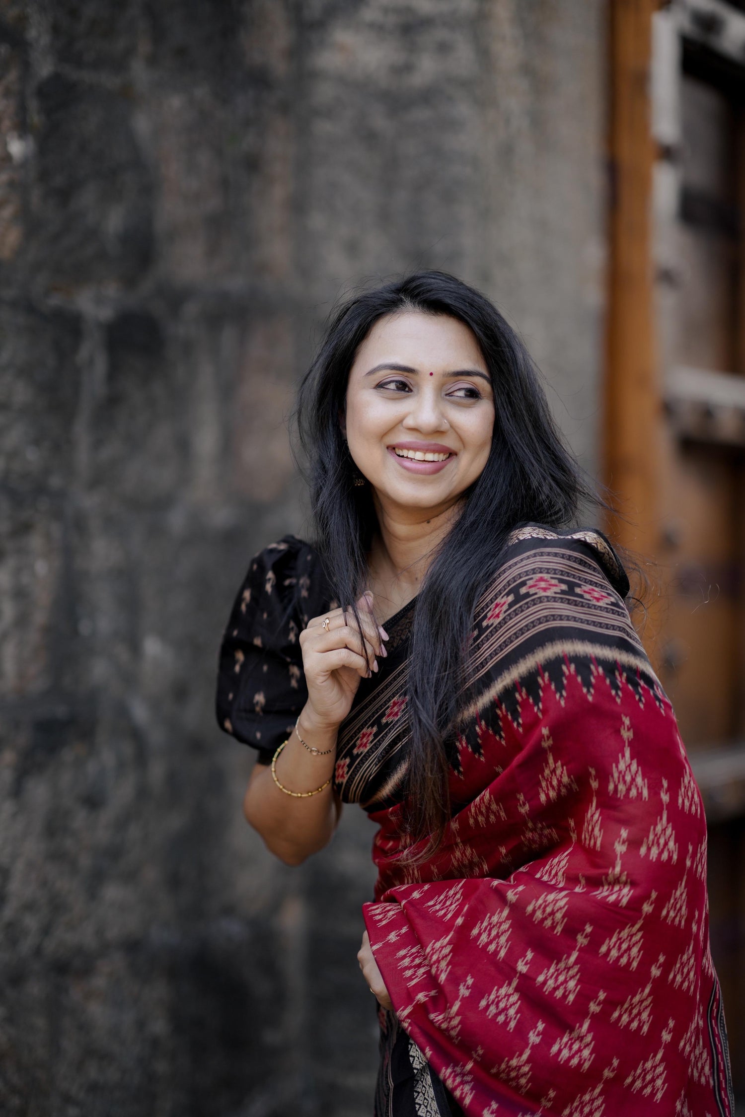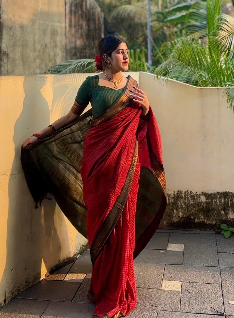 Ahaana inspired pure kanchi cotton saree in black and red combo - Prebooking