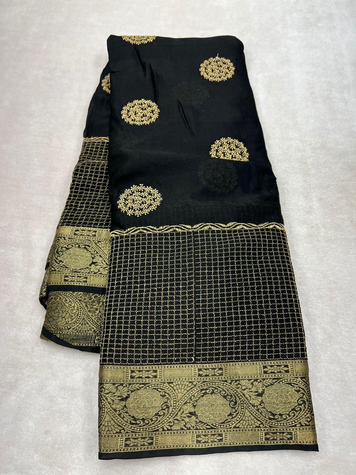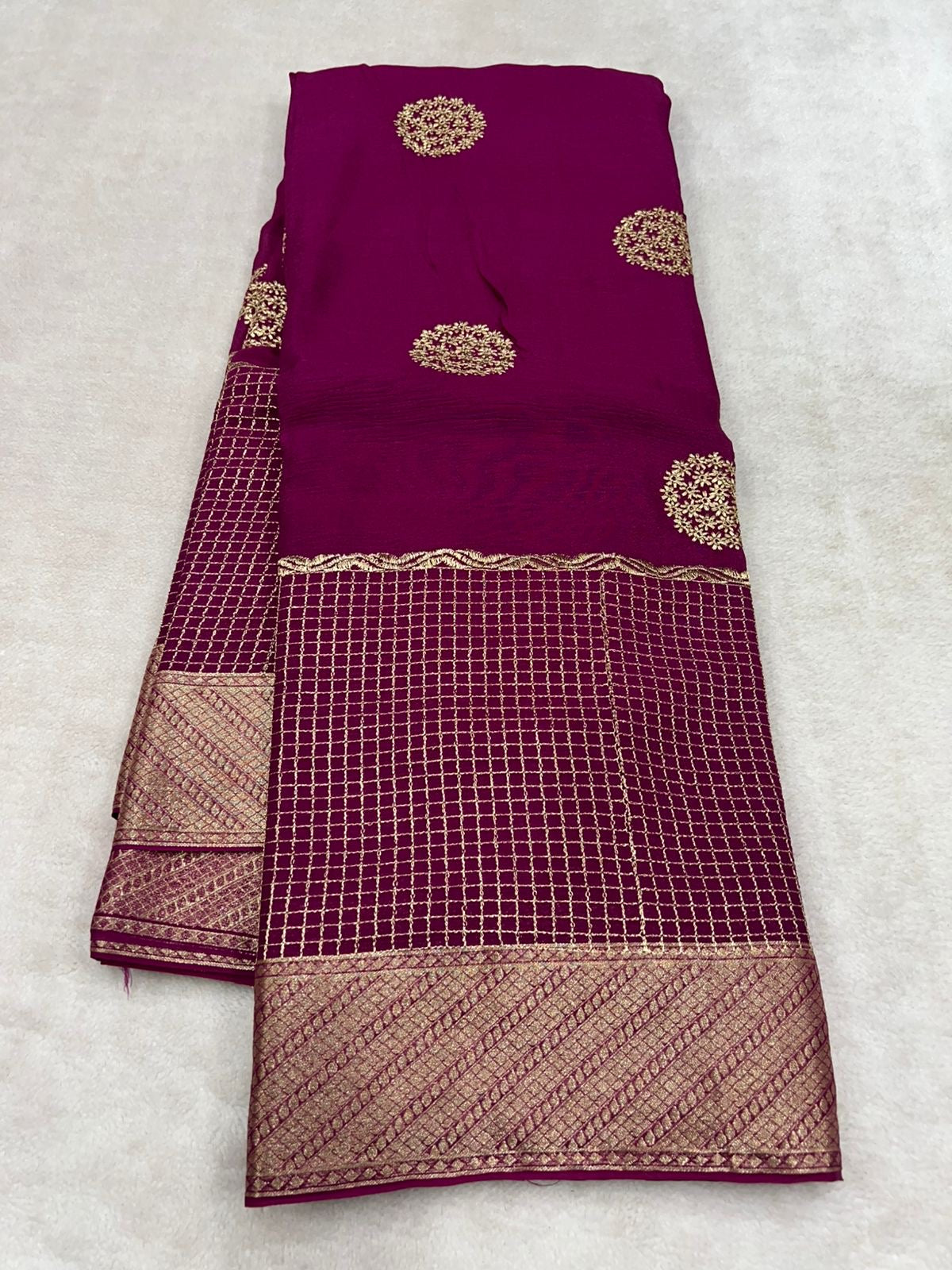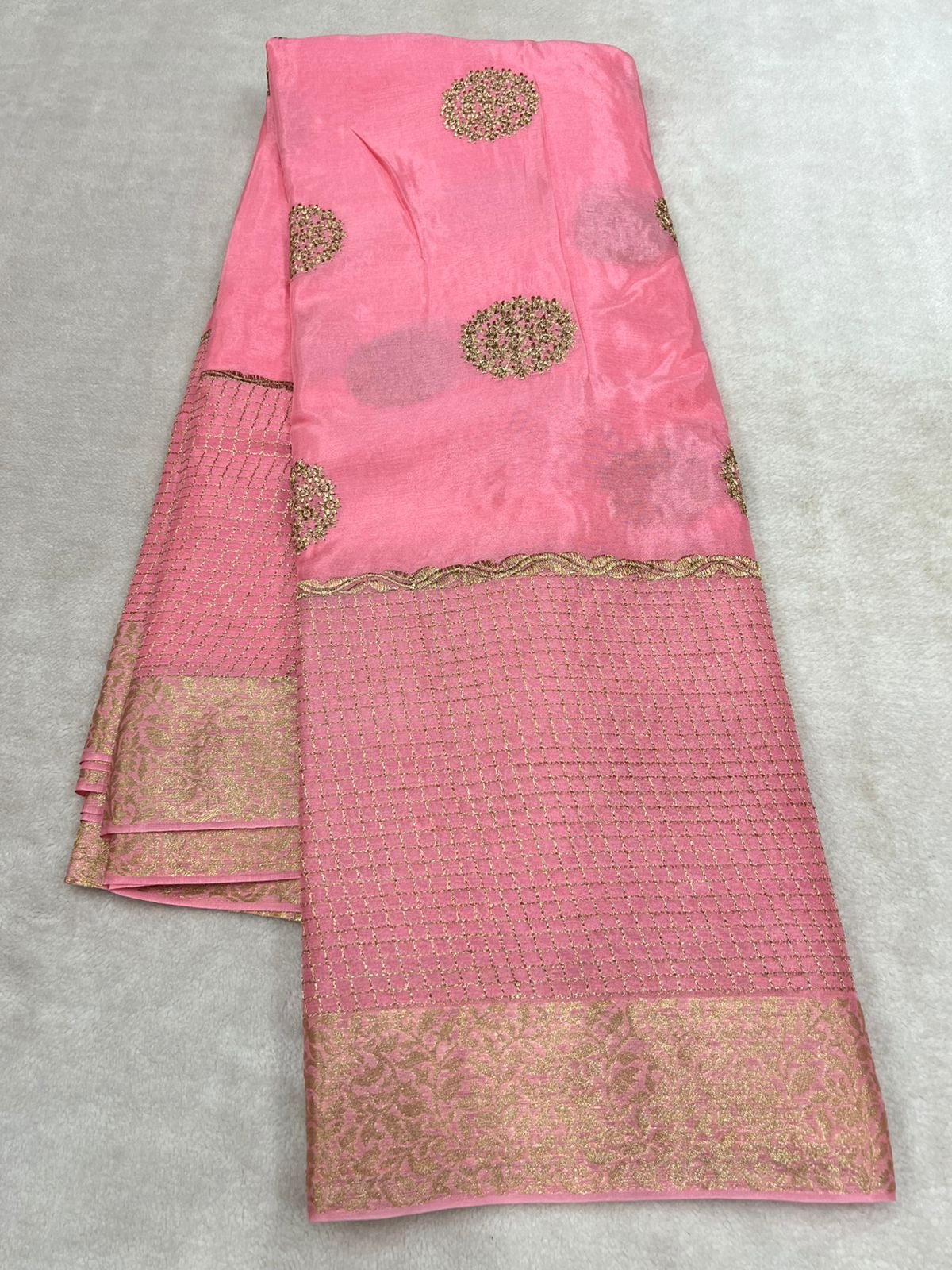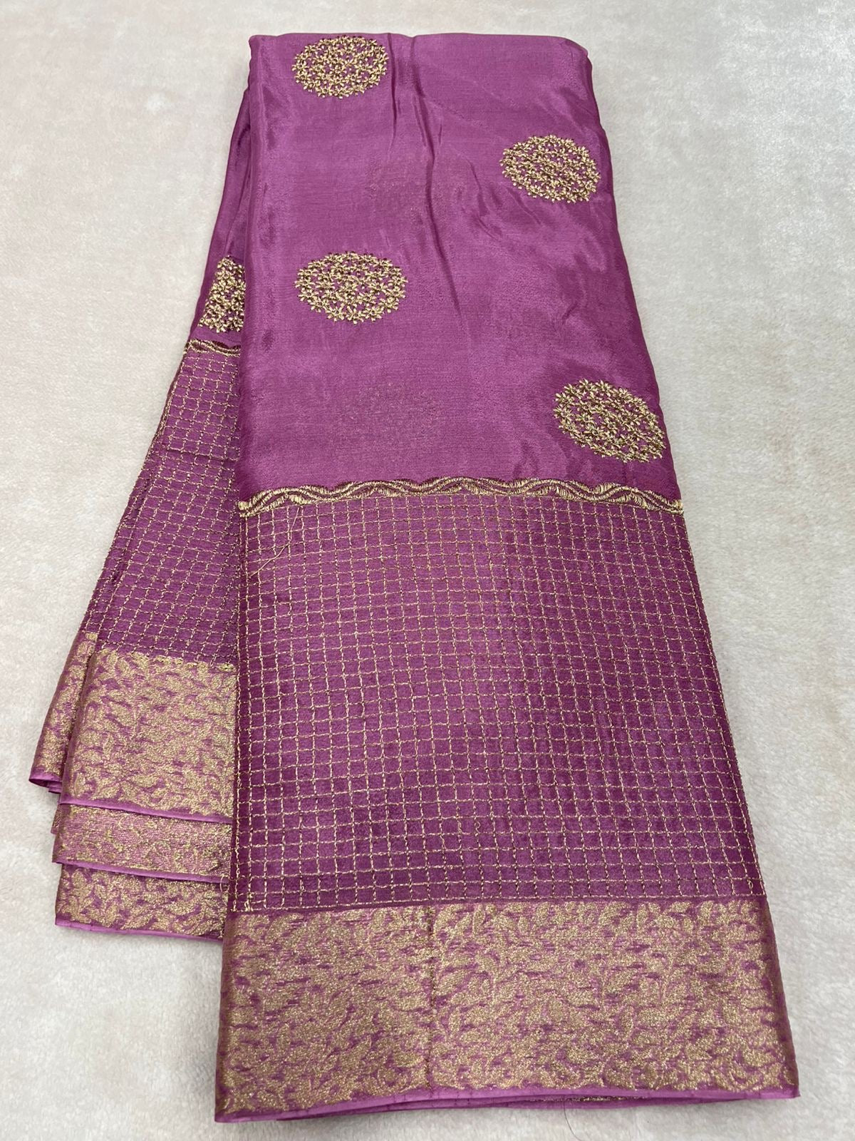 Pure chinon silk saree with embroidery work all over and border.. comes with running blouse