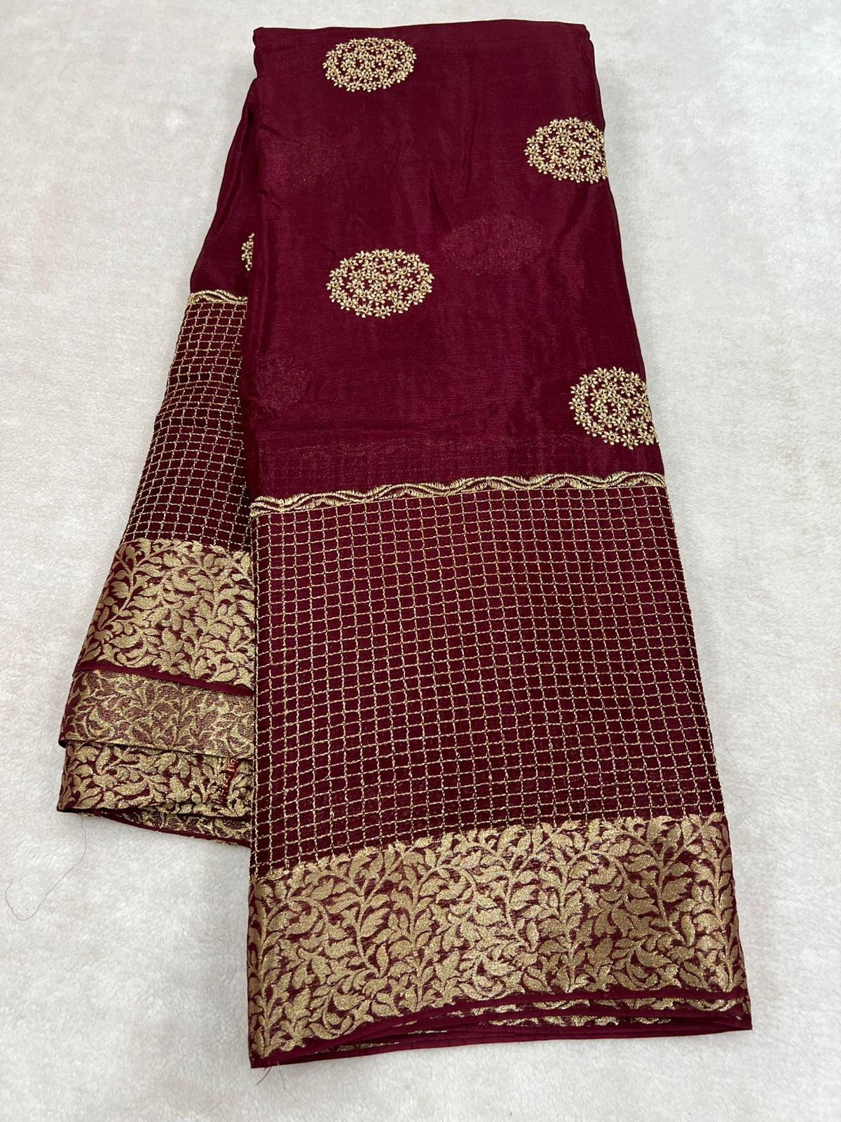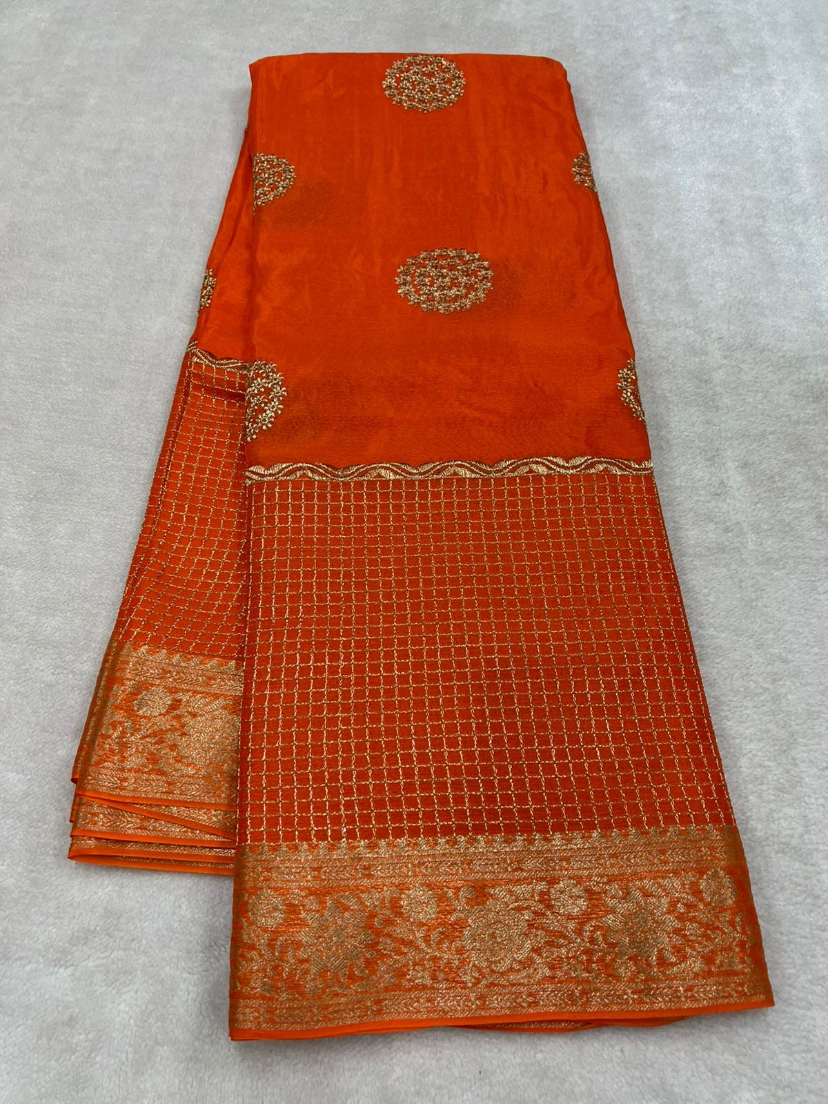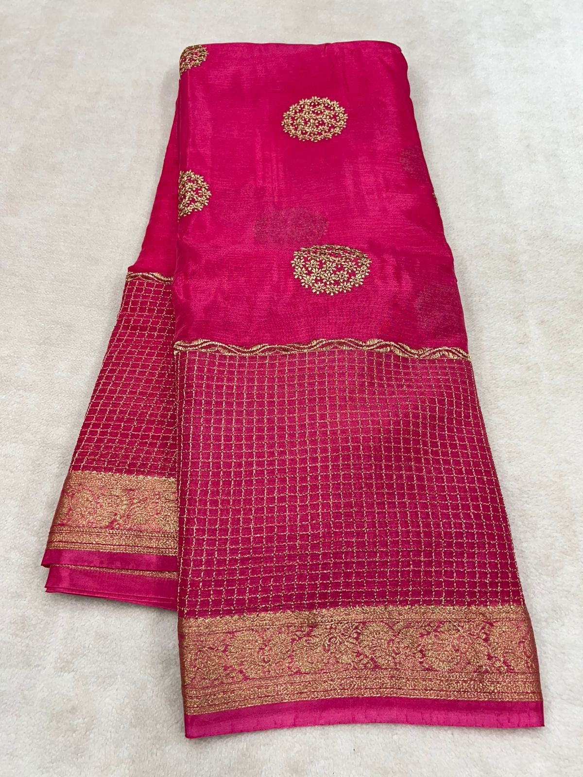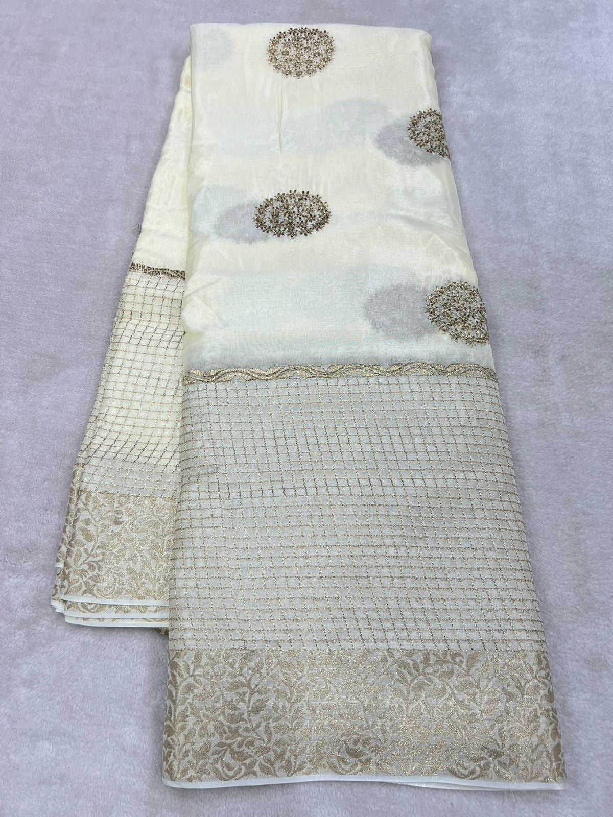 Pure chinon silk saree with embroidery work all over and border.. comes with running blouse