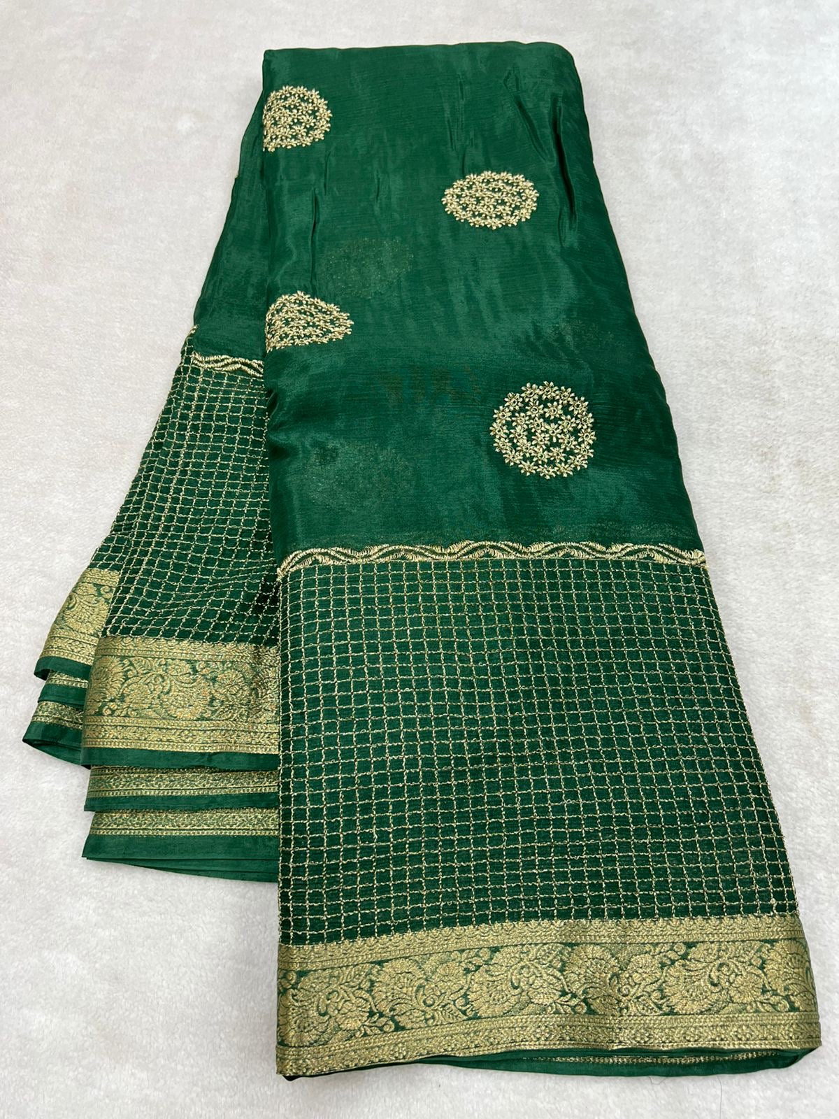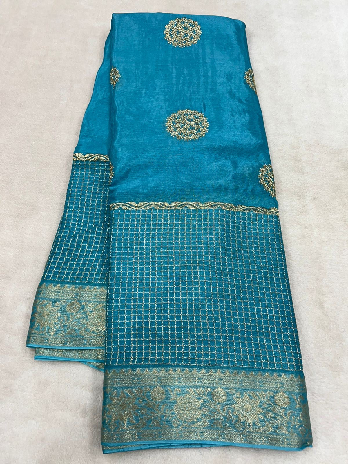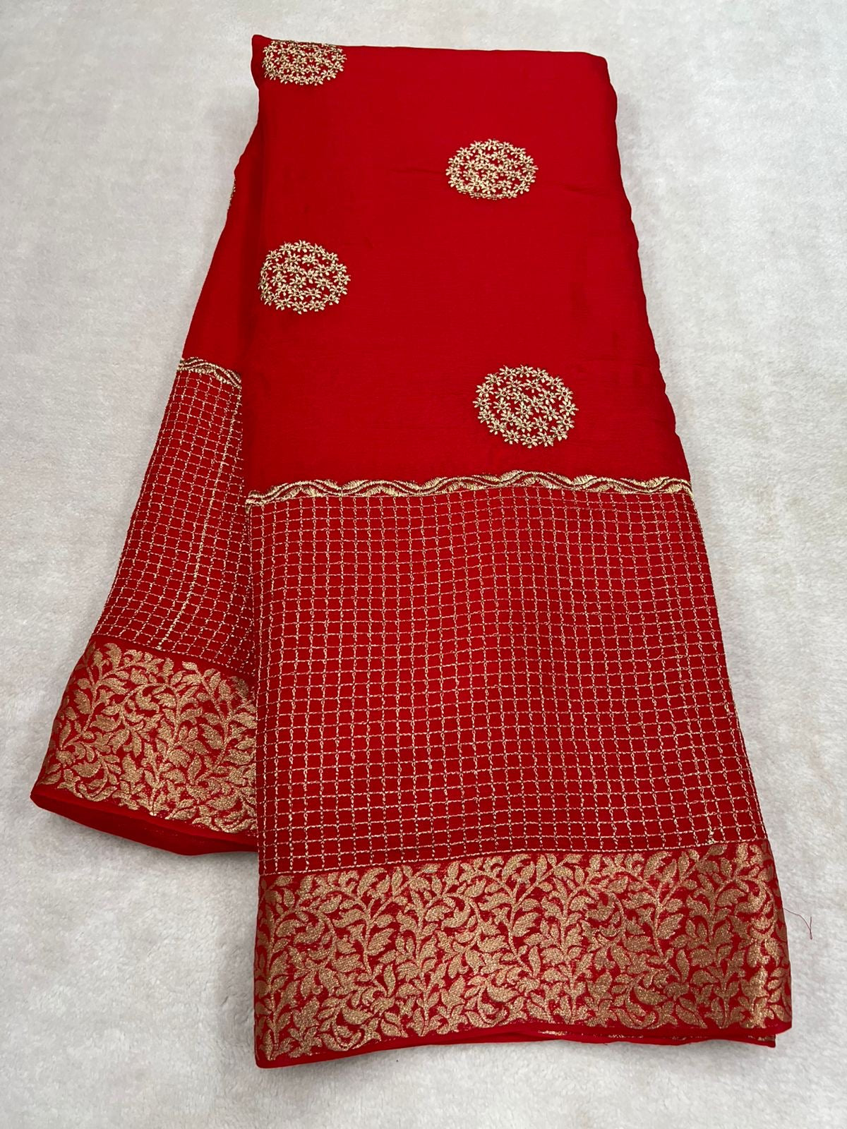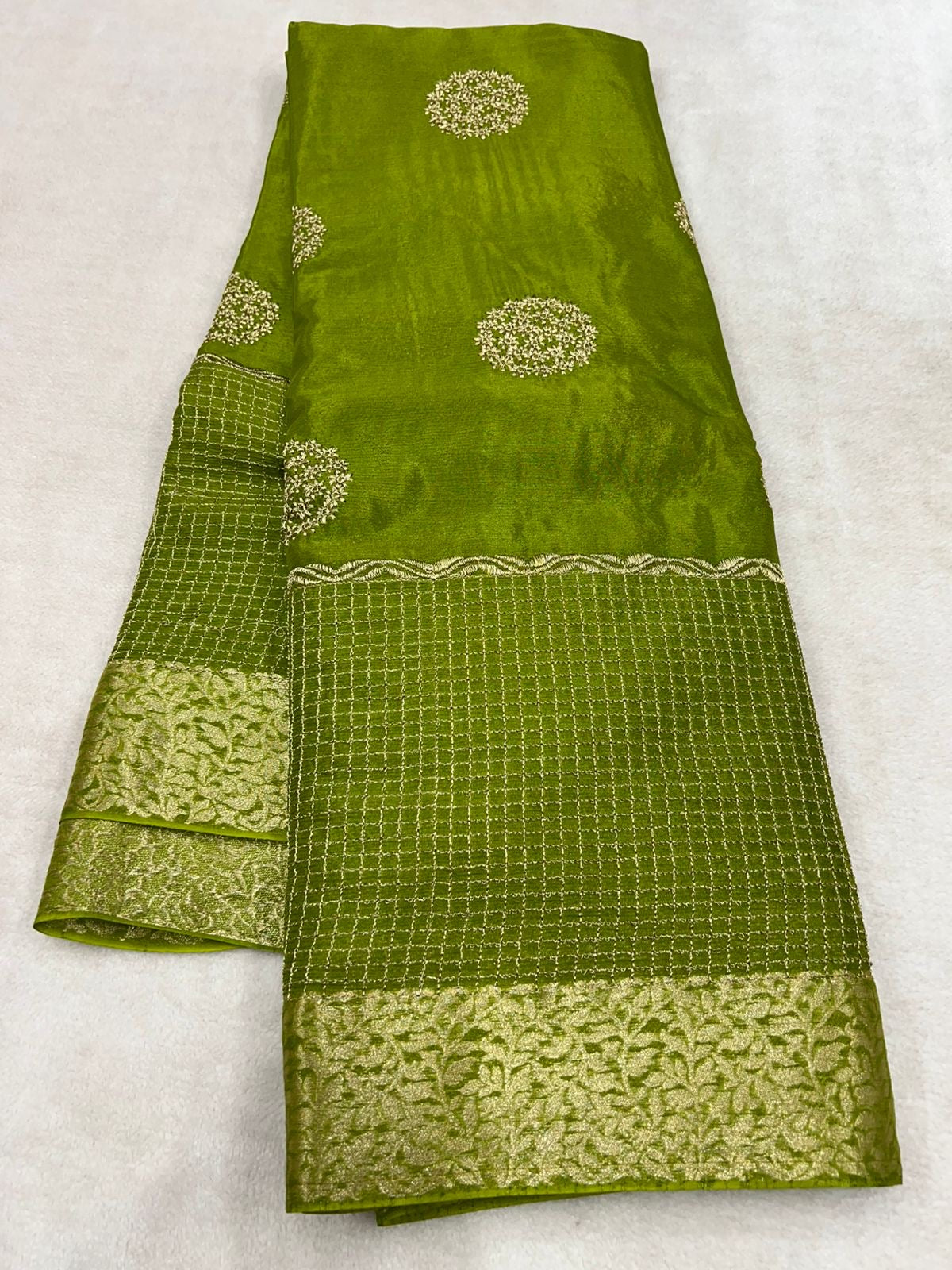 Pure chinon silk saree with embroidery work all over and border.. comes with running blouse