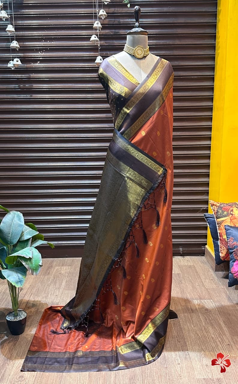Rust orange with coffee brown woven Border and all over traditional butties in the body and grand woven pallu with exclusive tassels
